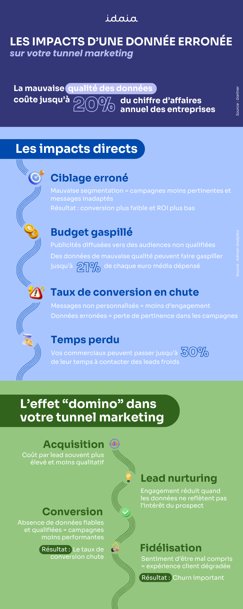 Dans un environnement où le marketing piloté par la donnée devient incontournable, la qualité des données est devenue un enjeu stratégique majeur pour toutes les entreprises. À l’heure où chaque décision marketing repose sur l’analyse et l’exploitation de données clients, une information erronée peut avoir des répercussions en cascade sur l’ensemble du tunnel de conversion. En 2026, alors que les budgets marketing sont scrutés avec une attention accrue et que le ROI est au cœur de toutes les préoccupations, comprendre l’impact réel d’une mauvaise qualité de données n’est plus optionnel. Dans cette infographie, nous décryptons les conséquences directes et l’effet domino qu’une donnée erronée provoque sur vos performances commerciales, de l’acquisition jusqu’à la fidélisation.